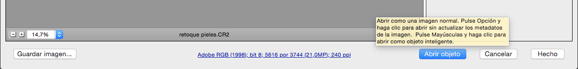 Otra opción es modificar las opciones de flujo de trabajo (parte inferior en azul) Y marcamos la casilla “abrir como objetos inteligentes” de esta manera todos los archivos se abrirán como objetos inteligentes en photoshop.