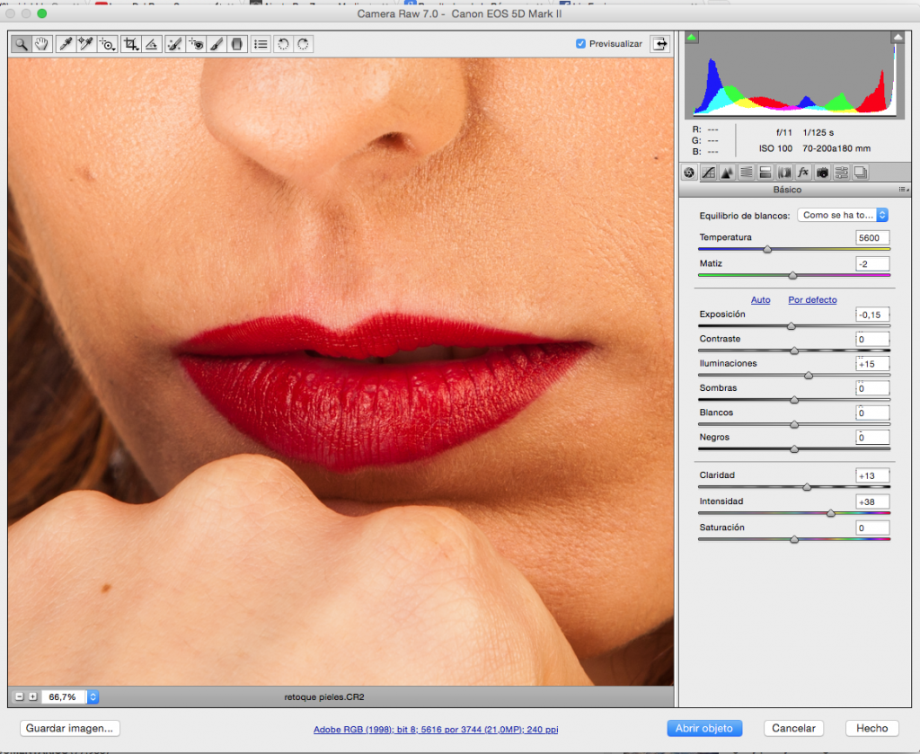 3. Editamos de nuevo la fotografía en RAW solo para los labios y el pelo
